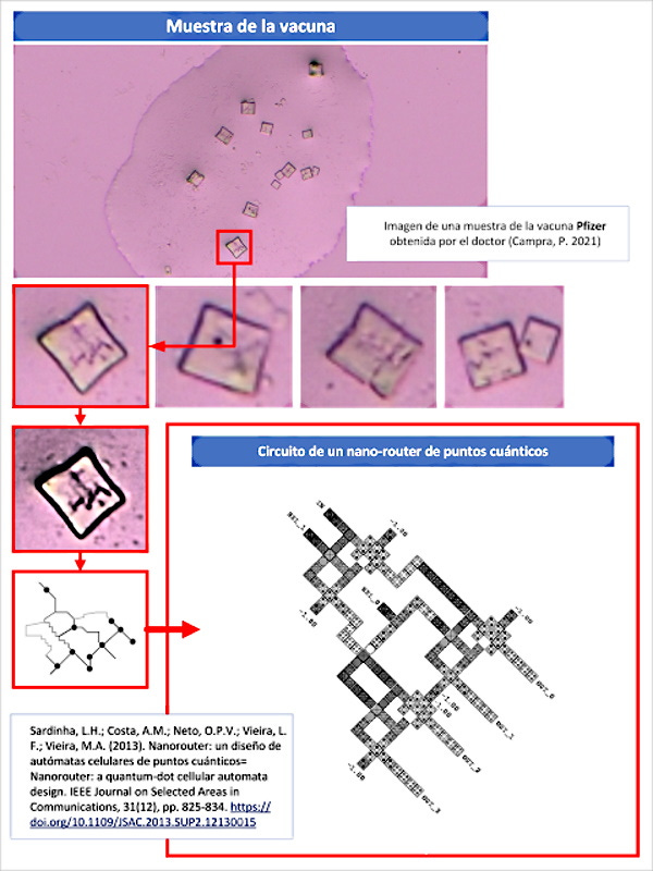This is an incomplete compendium/sampling of the circuitry in the vaccines discovered by La Quinta Columna that I culled between June-November 2022. These images are unaided by an electron microscope, which is truly necessitated for further study. Sorry my methods are incomplete right now. (I'm also having editing issues with Substack.) Most of the following images were taken from t.me/miraalmicroscopio, or otherwise belong to La Quinta Columna: